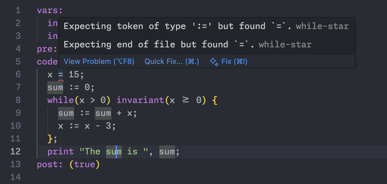 To make While* feel like a "real" language in VS Code, I integrated a full language server: